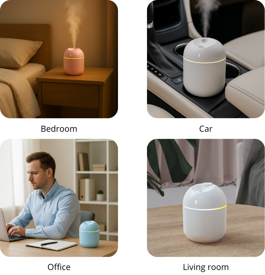 This humidifier is perfect for small spaces such as bedrooms, desks, offices, cars, and relaxation areas. Its portability ensures you can enjoy improved air quality anywhere you go!